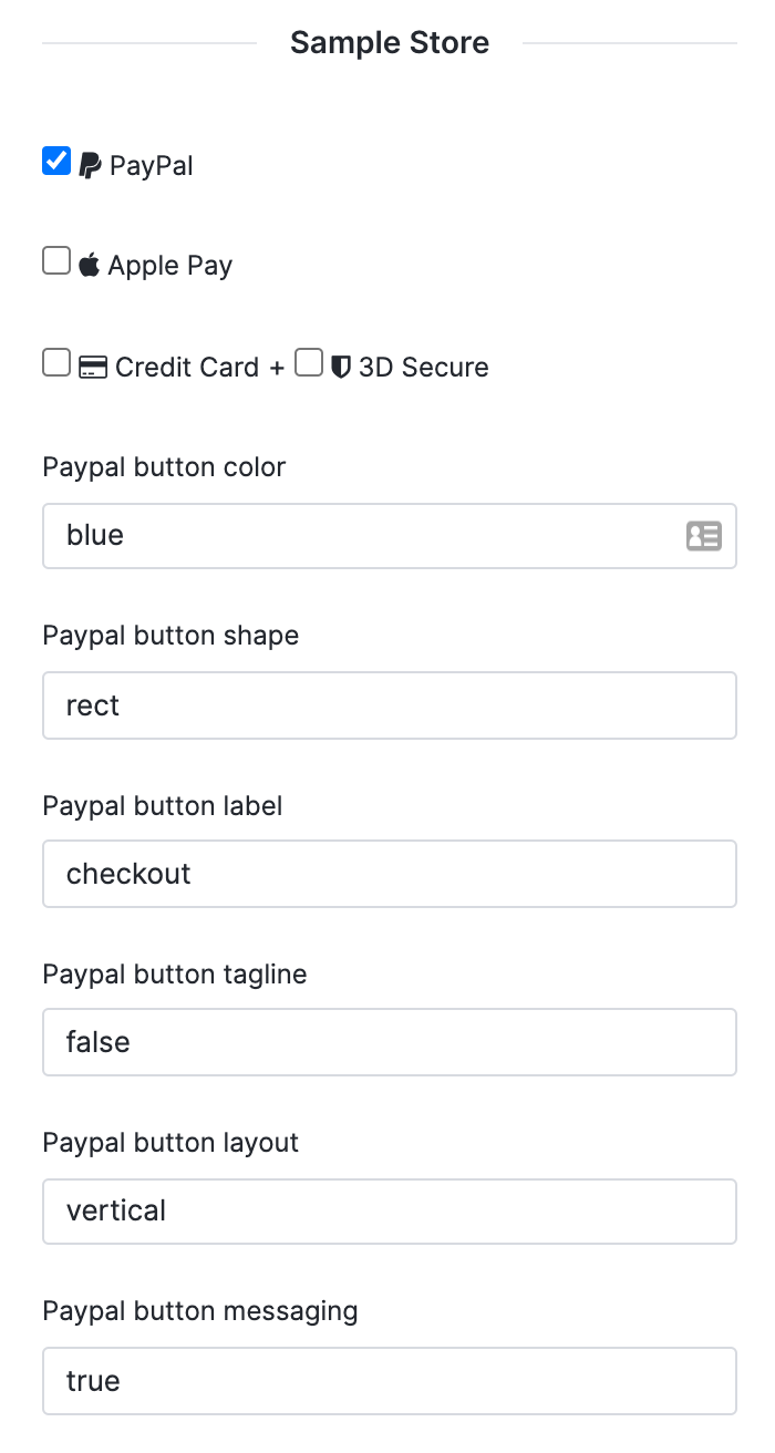 Next, on the payment method index, you'll want to create a new payment and input all of the relevant information. You'll also need to set the PayPal checkout flow to checkout instead of vault - PayPal is not able to offer services like pay in 4 if you're using the vault flow, so they do not support using the messaging component for that flow.