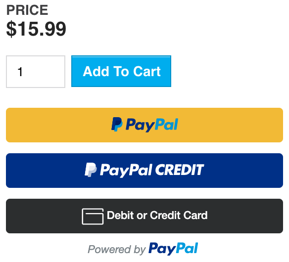 In addition to adding payment buttons to the cart, we've also added them to the product page! Unlike the cart button, product payment buttons act as an "instant checkout" feature - this will take the user to PayPal for payment, and the order will be created and populated will all necessary information. If your users just want the one item, they can skip almost the entire checkout process. Like the cart button, on payment, the user will be directed to the order confirmation page for final confirmation.