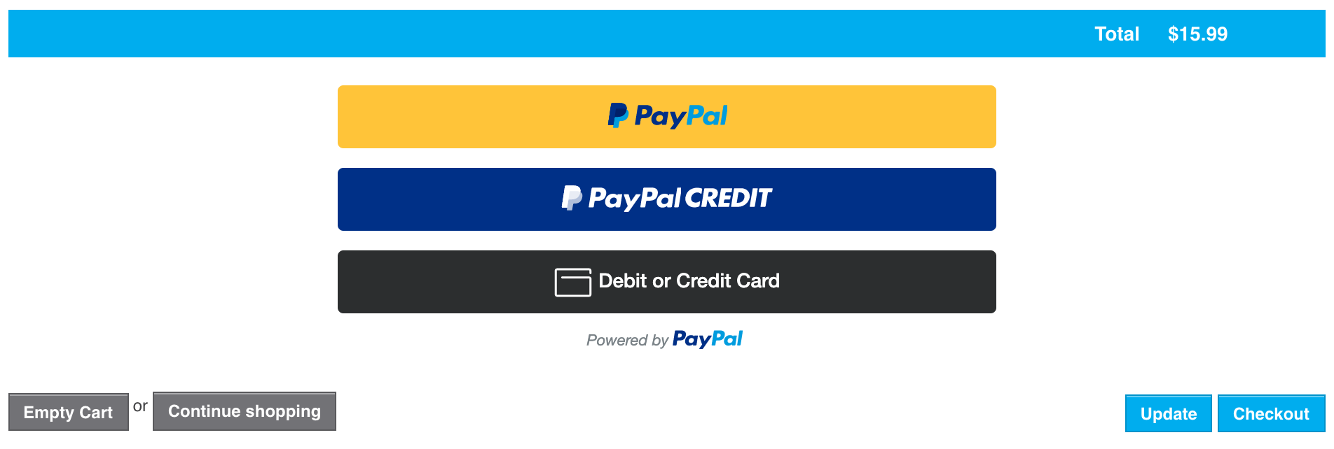 Now your users can check out directly from your cart! This streamlined process will take the user to PayPal. During the checkout process, PayPal will collect the necessary shipping information and send it back to your server. Upon confirming the payment, the user will be taken to the order confirm page, where they can complete their order.